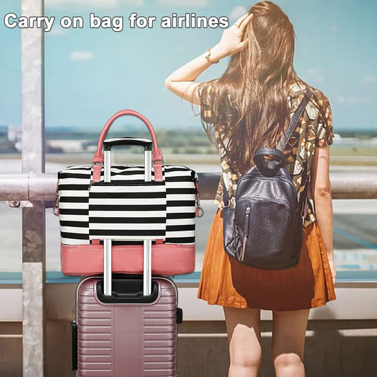 Womens Travel Weekender Bag Canvas Carry on Overnight Tote Luggage Duffel Beach Bags (Pink Leather Black Stripe with Shoe Compartment)